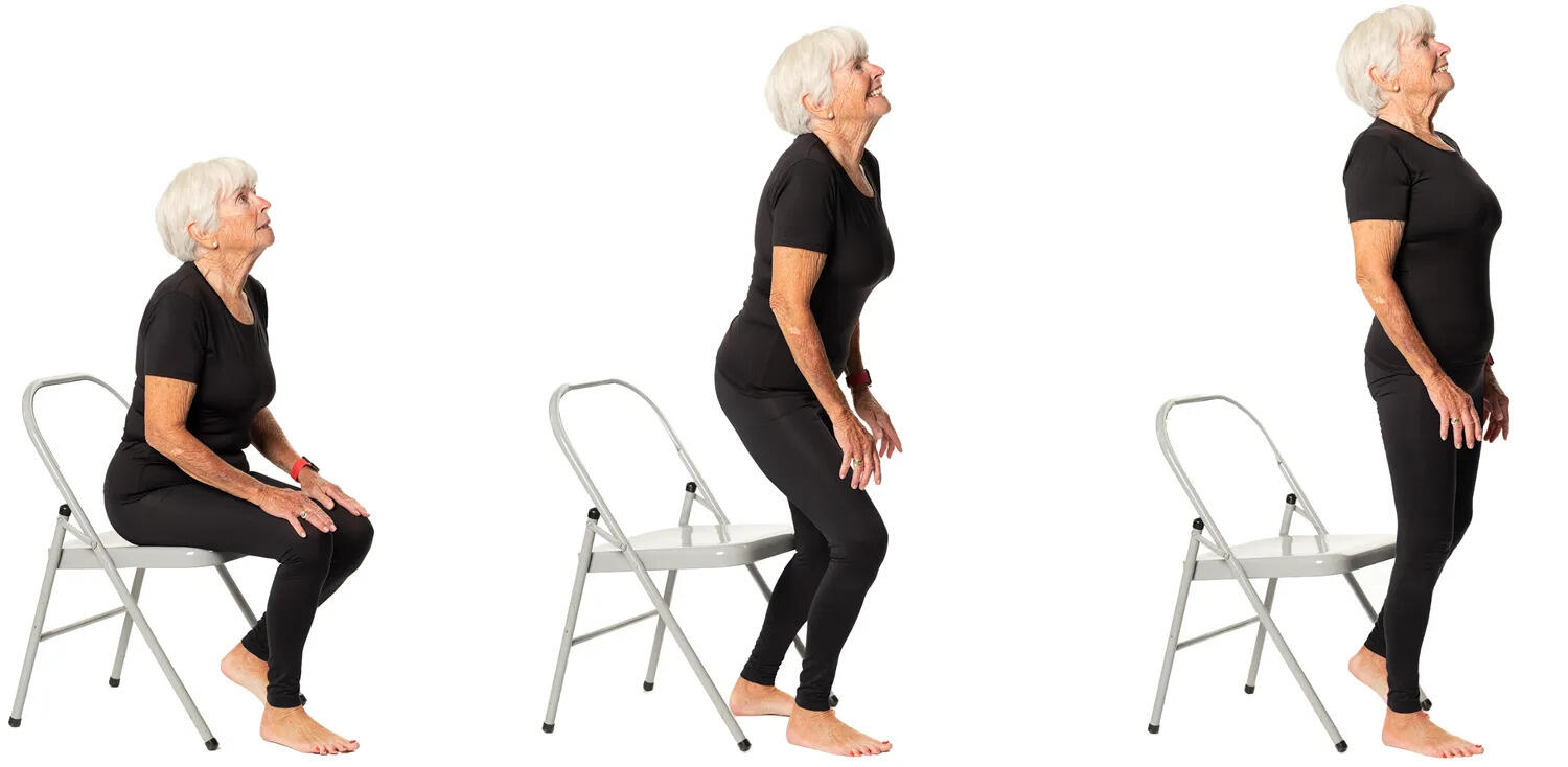 Sit near the front edge of a sturdy chair, feet flat on the floor.